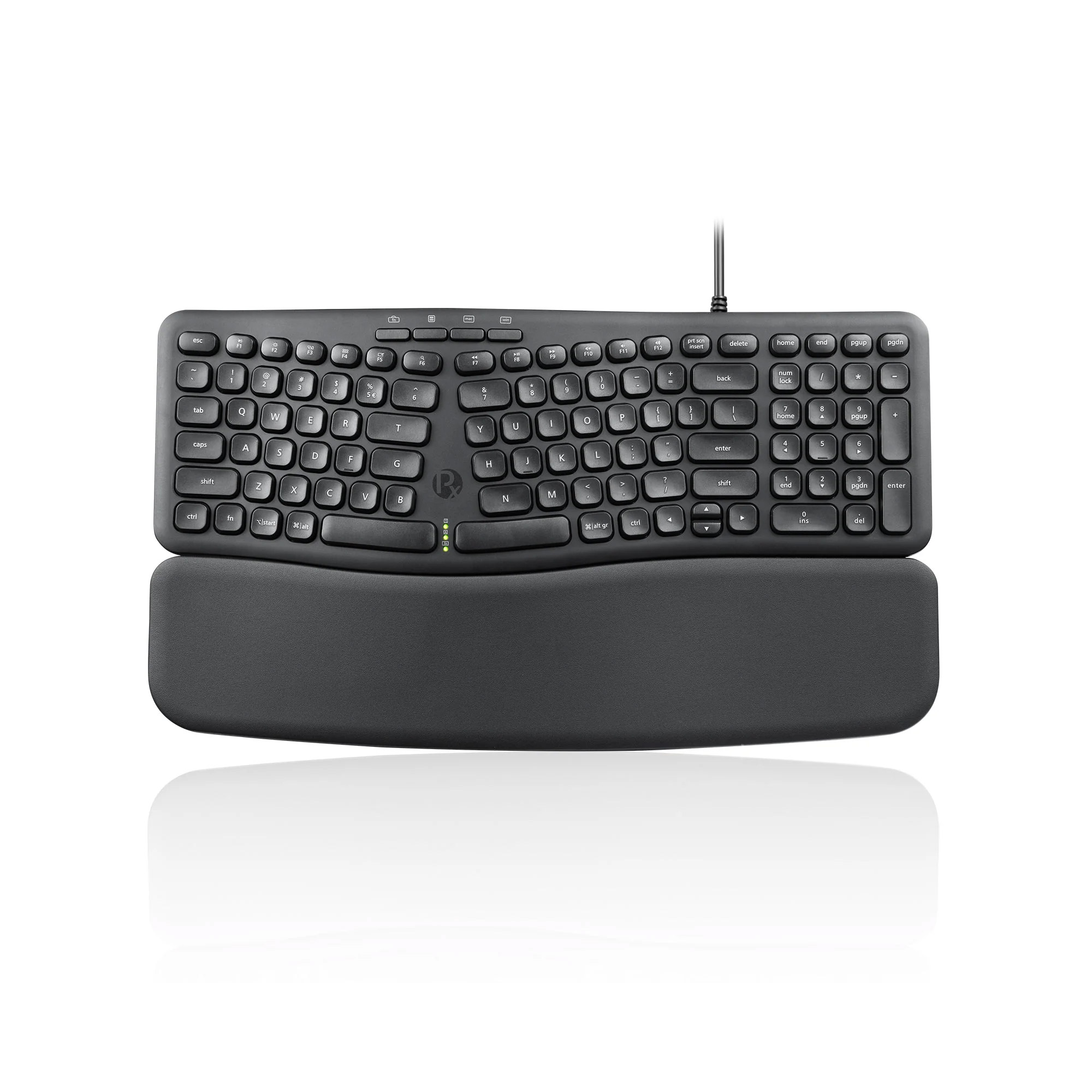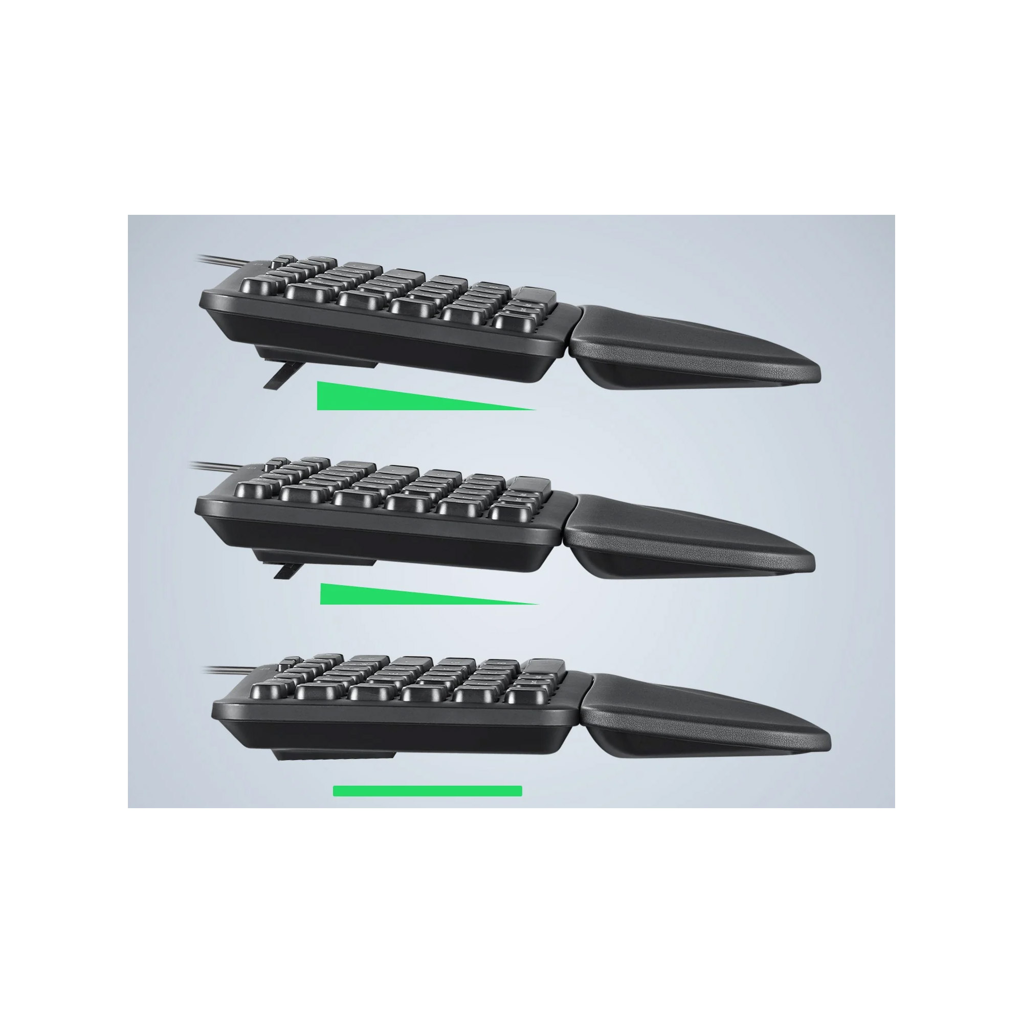 ERGONOMISCHES DESIGN FÜR MEHR KOMFORT: Das ergonomische geteilte Design, die kompakte Wellenform und der integrierte Nummernblock reduzieren die Belastung und verkürzen den Abstand zur Maus, was die Produktivität steigert (Abmessungen: 415 x 145 x 41 mm).