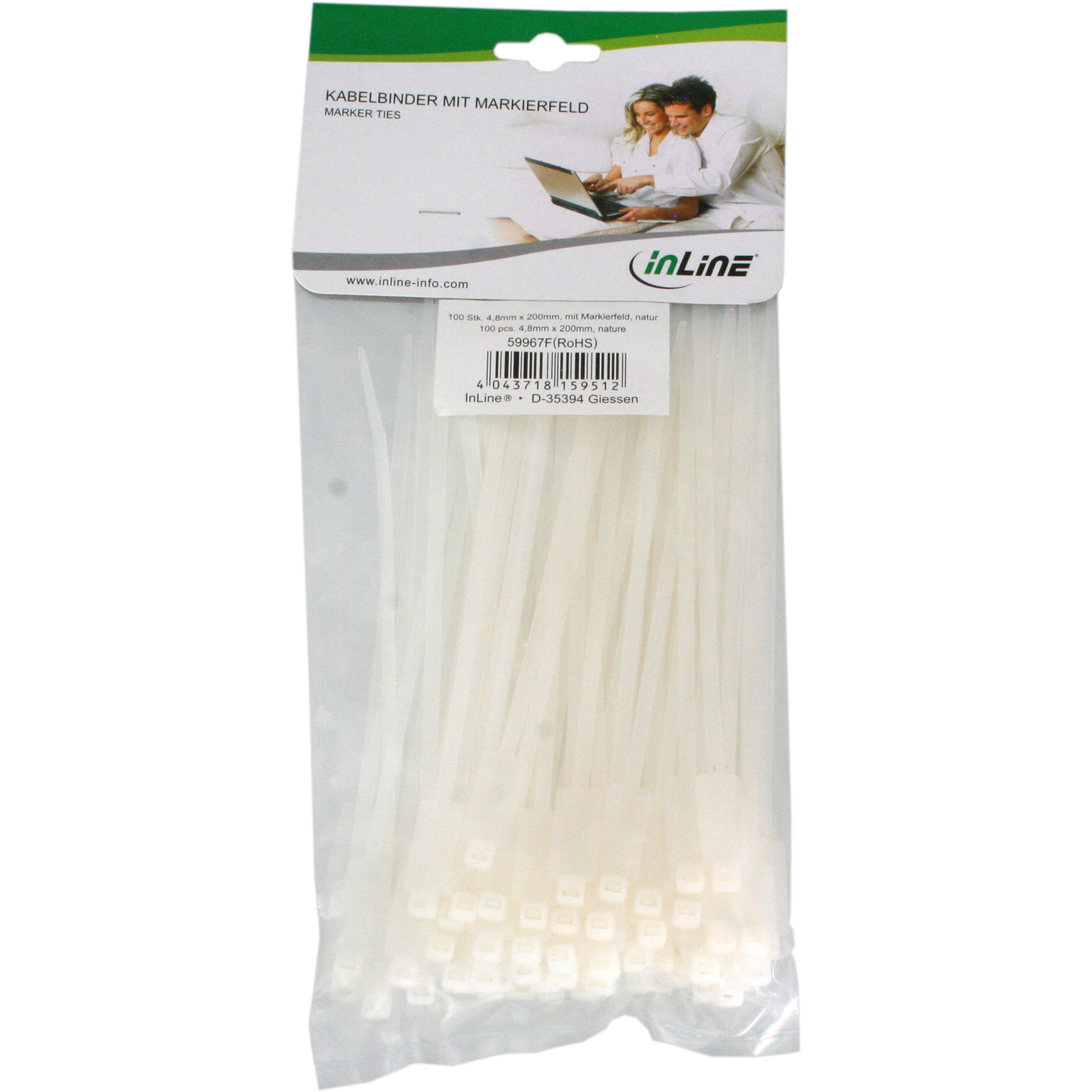 InLine® Kabelbinder mit Markierfeld, Länge 200mm, Breite 4,8mm, 100stk. Die Inline- Nylon-Kabelbinder (aus Polyamide 6.6) sind schnell und einfach per Hand oder mit Hilfswerkzeugen anzubringen und versprechen mit der innenliegenden Verzahnung einen enormen halt. Äußerst Widerstandsfähig gegen Seewasser, Öle , Fette und dergleichen. Zur Lagerung empfehlen wir, darauf zu achten, dass die Kabelbinder im geschlossenen Beutel aufzubewahren sind. Zusätzlich empfehlen wir die Kabelbinder nicht der direkten Sonneneinstrahlung oder direkten Wärmezufuhr durch Heizkörper auszusetzen, um bei längerem Lagern Austrocknungen vorzubeugen. Unsere Kabelbinder entsprechen der ISO EN50146 Norm. Maße vom Markierfeld (Höhe x Breite): 27mm x 13mm